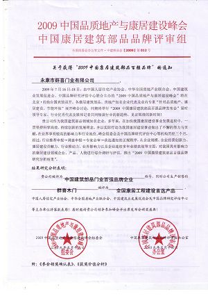 關于獲得“2009中國康居建筑部品百強品牌”的通知