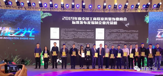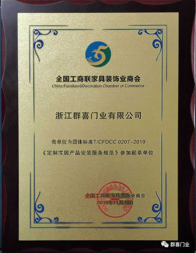 作為全國工商聯家具裝飾業商會會員單位,群喜門業全程參與推動了《定制家居產品安裝服務規范》的起草工作,并被授予T/CFDCC 0207-2019《定制家居產品安裝服務規范》參加起草單位榮譽稱號。