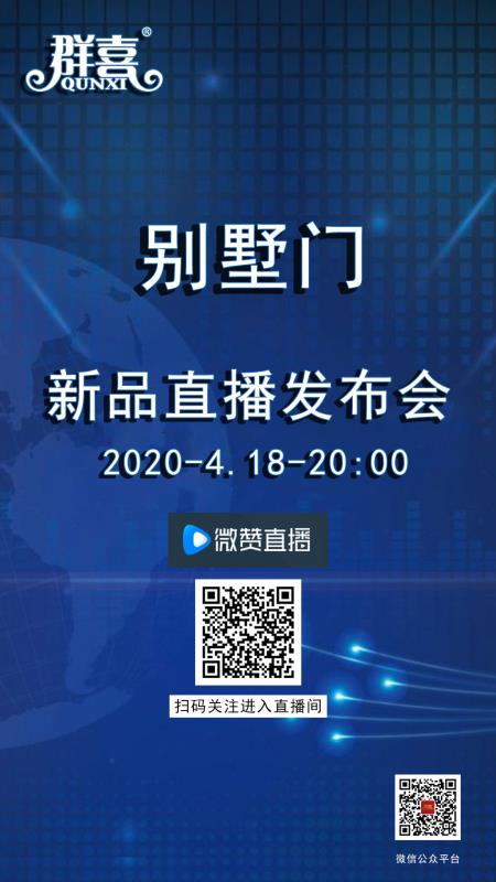 新的一年,群喜門業迎來了銷售、產品全面轉型升級,群喜別墅門線上新品直播發布會,多款重磅新產品......將于4月18日晚20:00與大家見面小伙伴們快來圍觀!讓您足不出戶,即可參與線上搶購新品。