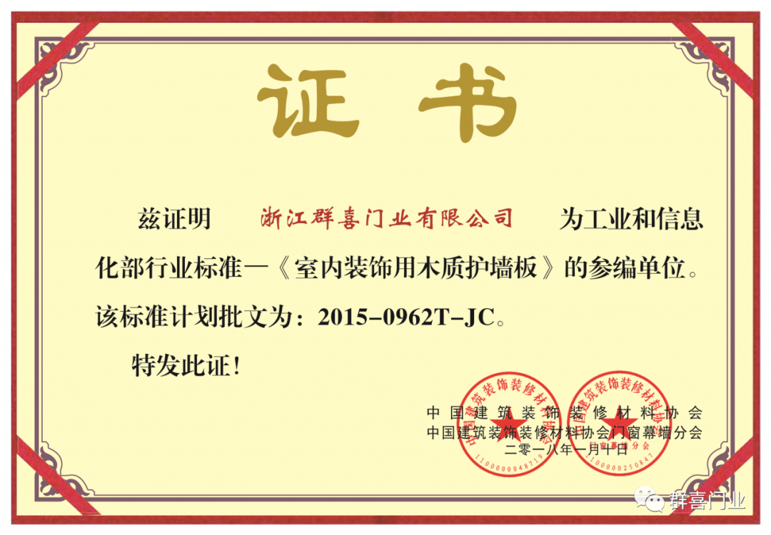 群喜門業(yè)以高品質(zhì)產(chǎn)品和服務(wù)為企業(yè)發(fā)展之根基,從創(chuàng)立之初起就以高標(biāo)準(zhǔn)高規(guī)格來嚴(yán)格要求自身,同時也積極參與行業(yè)標(biāo)準(zhǔn)的規(guī)范化,推進(jìn)行業(yè)健康有序發(fā)展。本次榮幸參與《室內(nèi)裝飾用木質(zhì)護(hù)墻板》的標(biāo)準(zhǔn)制訂工作,充分肯定了群喜木門在產(chǎn)品生產(chǎn)安裝服務(wù)規(guī)范方面的示范與成果,再次履行了推動行業(yè)健康發(fā)展的企業(yè)責(zé)任。