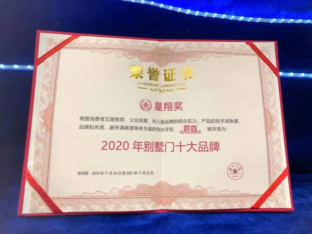 本次盛典榜單數(shù)據(jù)綜合分析了企業(yè)實(shí)力、品牌榮譽(yù)、網(wǎng)絡(luò)投票等各項(xiàng)實(shí)力數(shù)據(jù)所評(píng)選出。在當(dāng)晚星光璀璨的頒獎(jiǎng)典禮上,群喜憑借其雄厚的企業(yè)實(shí)力、領(lǐng)先的產(chǎn)品創(chuàng)新能力和精益求精的品牌價(jià)值突出重圍,榮膺“星翔獎(jiǎng)2020別墅門十大品牌”。