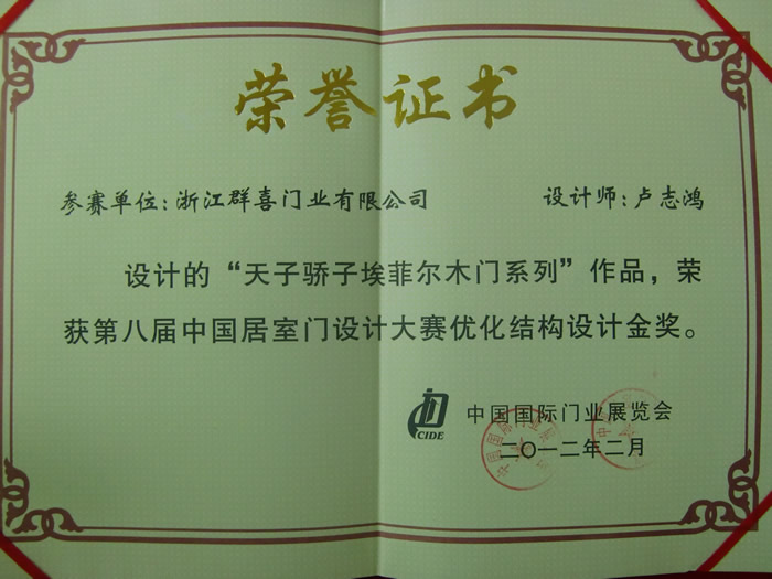 群喜門業(yè)“優(yōu)化結構設計金獎”證書