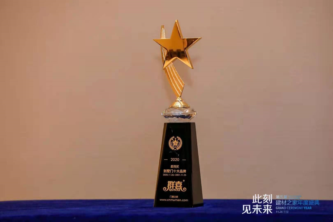 2020年11月26日,“此刻·見未來”第五屆建材之家年度盛典在海南三亞完美收官。群喜憑借其雄厚的企業實力、領先的產品創新能力和精益求精的品牌價值突出重圍,榮膺“星翔獎2020別墅門十大品牌”。