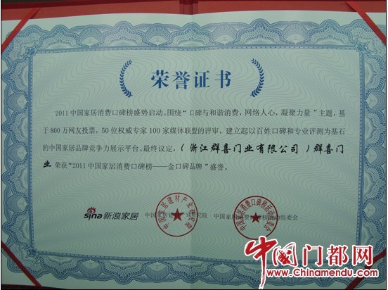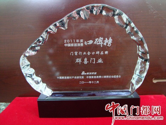 在近 500家參評的門類品牌中,群喜品牌在激烈的角逐中脫穎而出。與眾多知名廠家,如TATA木門、羅蘭木門、夢天木門、卡爾凱旋木門等等,一起獲此殊榮。身為群喜公司的人員更加的自豪!當我們手捧著獎杯和證書的時候,心里由衷的感謝廣大消費者。群喜發展到今天離不開你們的相伴,離不開你們的支持。相信在你們的鼓勵下,群喜未來的路也會是越走越寬廣!