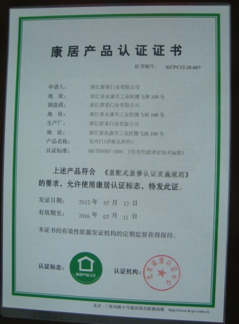 群喜公司在2011年7月開始籌備康居認證的一項事宜,經過康居認證專家幾個月的嚴格檢查和審核,也是群喜公司所有員工一直以來孜孜不倦的努力,在7月31號這天,群喜公司迎來了具有歷史意義的一天,北京康居認證的證書正式下來了,這是群喜門業榮獲全國鋼木門行業的首家殊榮,標志著群喜門業正式領軍鋼木門一線市場品牌,并與永康大型企業王力、春天、步陽、富新等知名一線品牌相并行,為經銷商開啟領航的燈塔,也標志著群喜在未來的道路上會越走越好,越走越遠,為全國鋼木門行業獻出群喜門業自己的一份力量!
