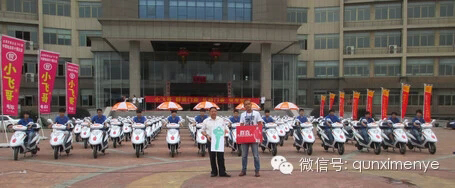 白色的電動車排成了一個方陣,四周插上群喜門業的彩旗,車上還獨家粘貼了群喜代言人相聲大師李金斗的代言肖像,這車開在路上,包管回頭率百分百。