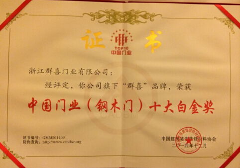 在所有群喜家人的努力下群喜門業(yè)喜獲中國門業(yè)十大品牌白金獎