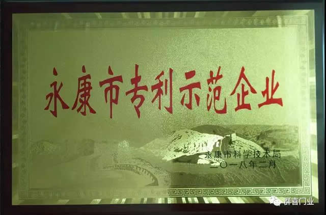 日前,群喜門業被浙江省知識產權局、浙江省經濟和信息化委員會評為“永康市專利示范企業”,再度榮譽閃耀,繼續保持豐富的創新力和無窮的開創性。