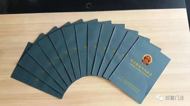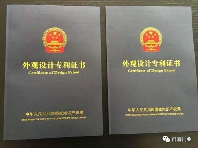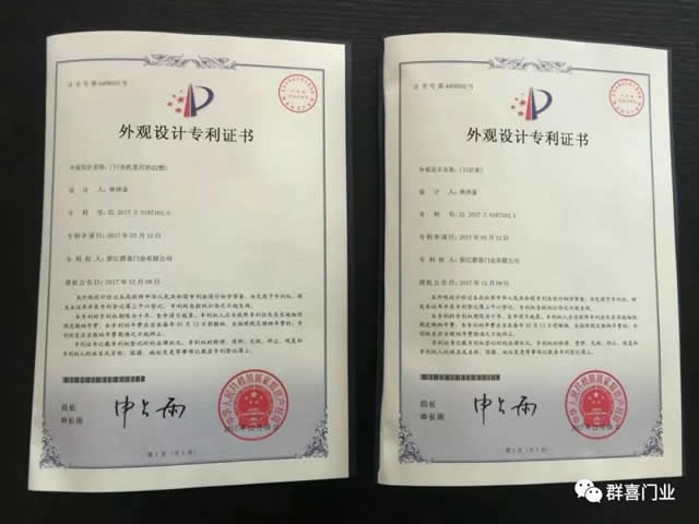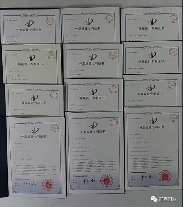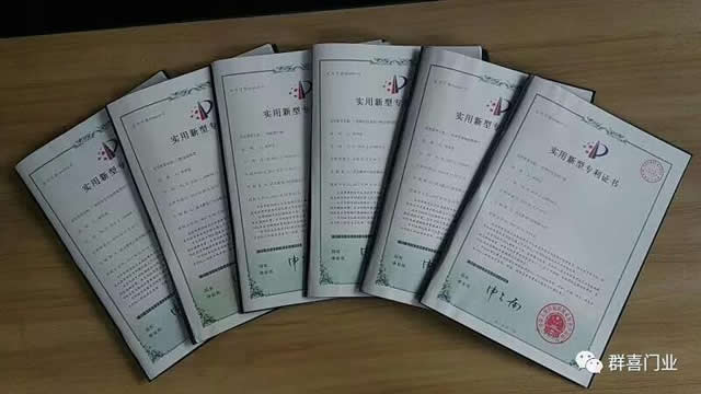 目前,群喜門業有實用新型專利12件,外觀設計專利29件。近年來,公司不斷加大對技術研發的投入力度,出臺專利獎勵制度,激發技術人員申報技術成果的積極性。群喜門業以“利國、利民、利業”為己任,從產品經營到資本經營,再到信譽經營,這是企業經營境界不斷提升的必然結果,因此,未來的競爭也將是品牌的競爭,信譽的競爭,品牌就是生命,信譽就是生機。