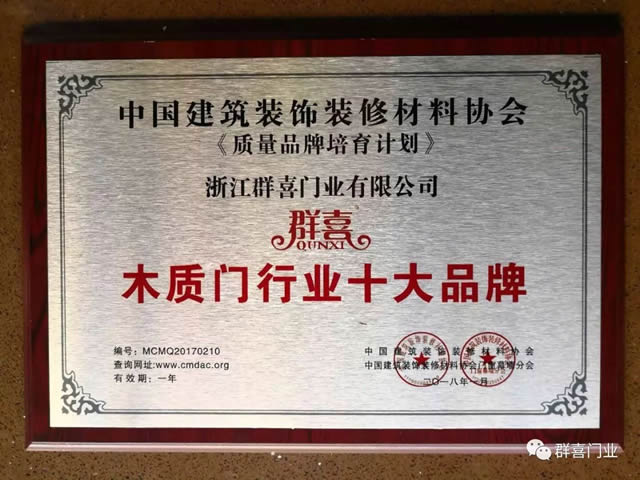 群喜門業(yè)獲“木質(zhì)門行業(yè)十大品牌” +
