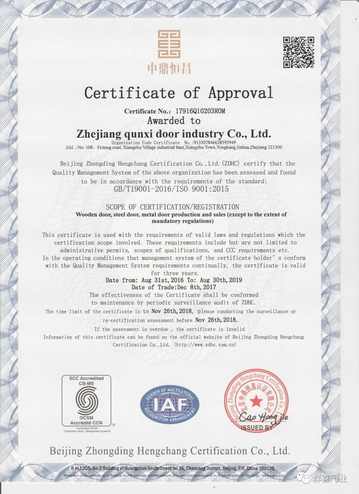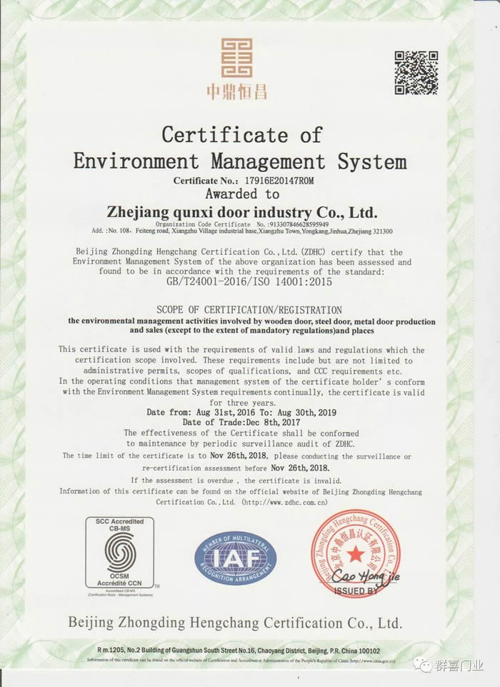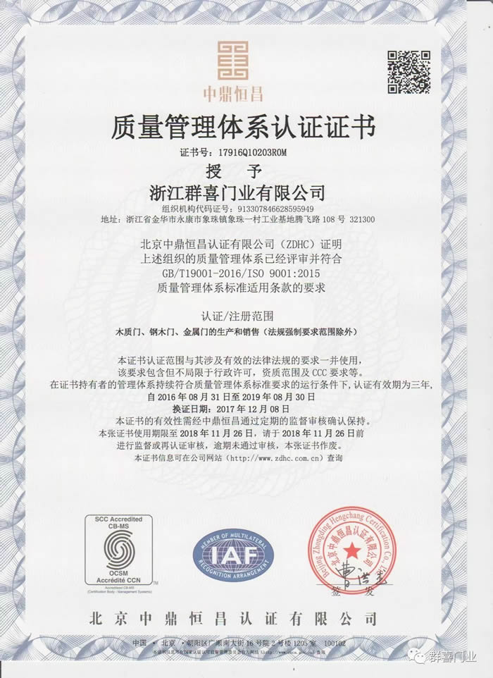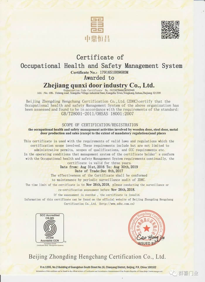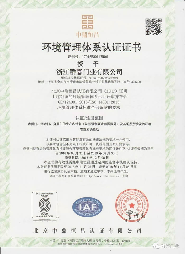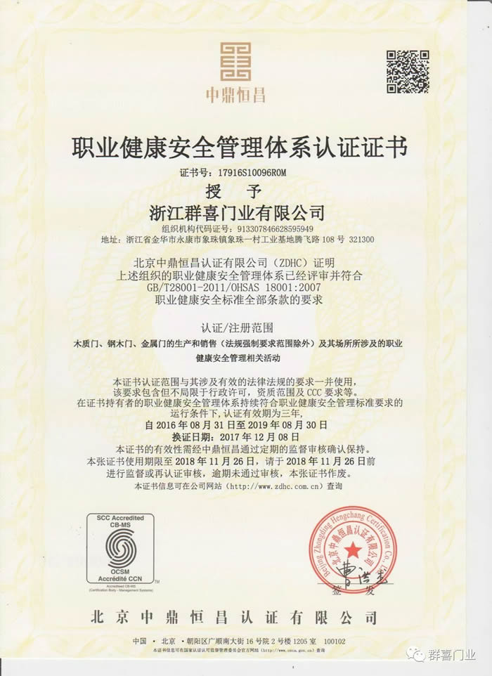 隨著群喜門業(yè)業(yè)務(wù)的不斷擴大,為了適應(yīng)發(fā)展的需要,與國際接軌。2017年,各部門在公司領(lǐng)導(dǎo)層組織和帶領(lǐng)下,認(rèn)真學(xué)習(xí)ISO9001:2015、ISO14001:2015體系新標(biāo)準(zhǔn),依據(jù)新版標(biāo)準(zhǔn)完善質(zhì)量、環(huán)境管理體系,同時進一步規(guī)范內(nèi)部管理,按照OHSAS18001:2007標(biāo)準(zhǔn)要求建立職業(yè)健康安全管理體系。